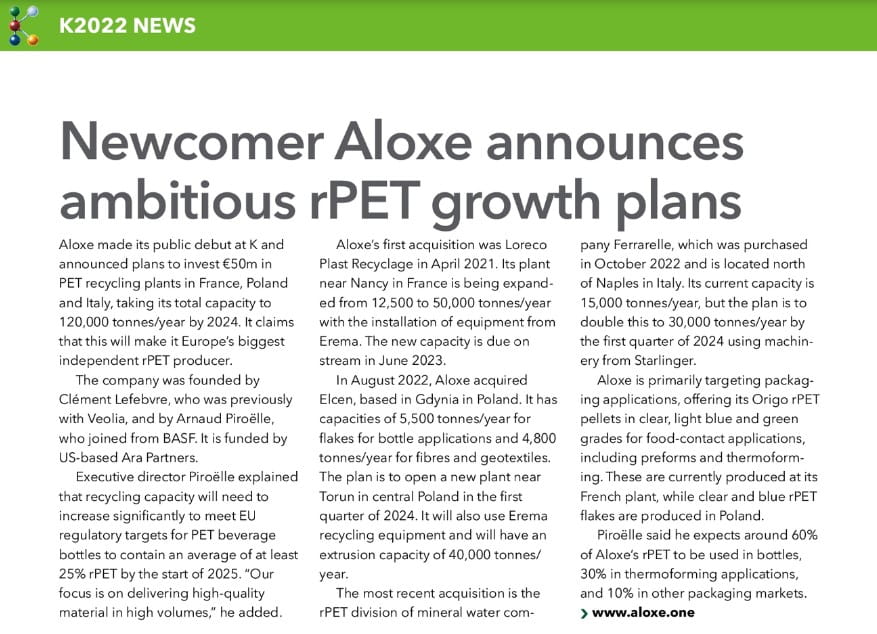 Aloxe est mis à l'honneur dans l'édition de Novembre-Décembre 2022 du magasine Plastics Recycling World, le magazine international de la chaîne d'approvisionnement du recyclage des plastiques.