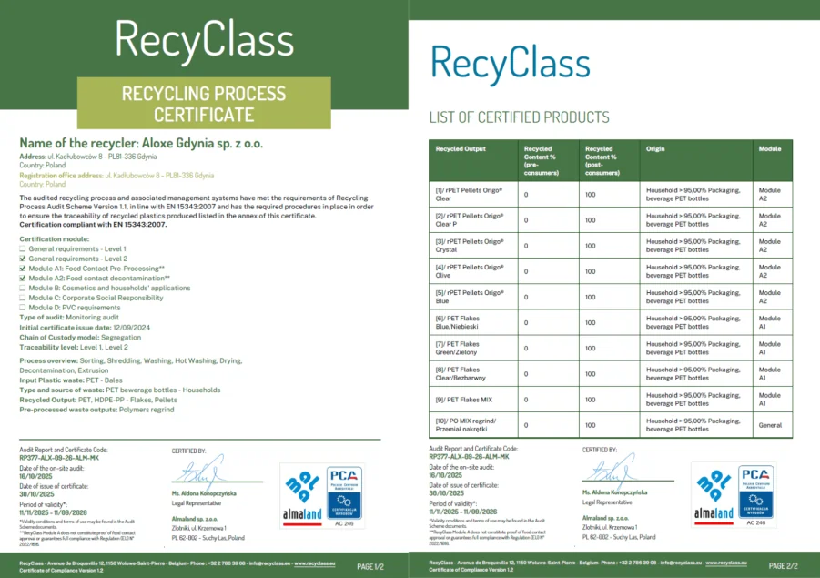 Nous sommes fiers d’annoncer que notre site de production basé à Gdynia en Pologne vient d’obtenir la certification RecyClass avec la combinaison GM + A1 + A2 — une reconnaissance européenne majeure de la qualité et de la traçabilité de notre rPET (polyéthylène téréphtalate recyclé).